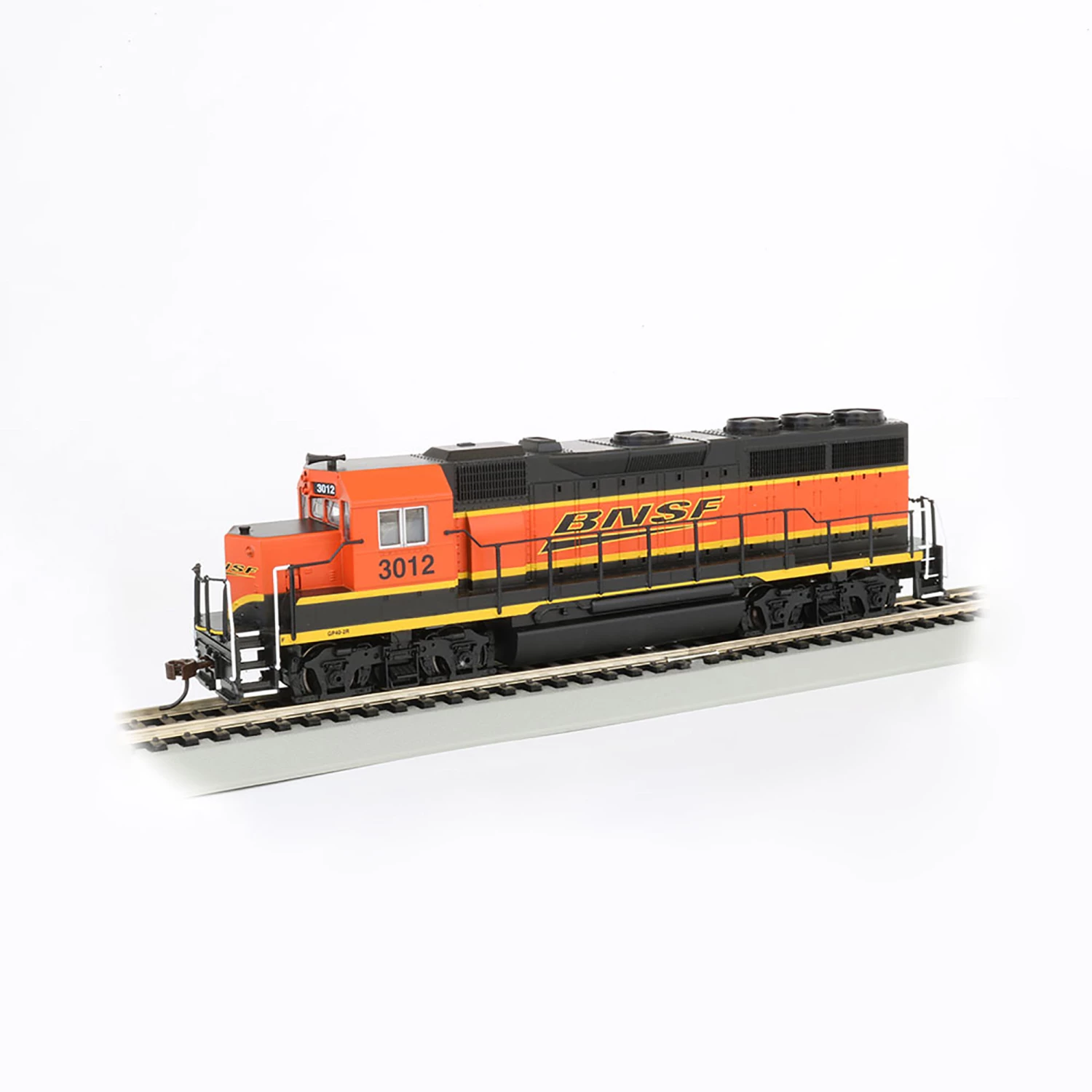 EMD GP40 – BNSF #3012 – HO SCALE. The GP40 was considered the top of EMD’S four-axle line when first introduced in the late 1960s. It visually differed from earlier GP models, featuring three radiator fans on its long hood, but was otherwise similar in style to the GP38, which entered production around the same time. The locomotive was popular for its ease of maintenance and standardized features and remained in production until succeeded by the GP40-2 in the early 1970s. Today, many remain in service hauling local freights and performing yard duties. The Bachmann HO Scale GP40 features realistic, prototypical detail, fine-scale handrails, and comes with a factory-installed 8-pin DCC plug for the decoder of your choice.